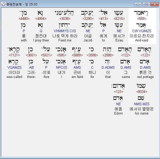 히브리어구약BHS,30 וַיֹּאמֶר עֵשָׂו אֶל־יַעֲקֹב הַלְעִיטֵנִי נָא מִן־הָאָדֹם הָאָדֹם הַזֶּה כִּי עָיֵף אָנֹכִי עַל־כֵּן קָרָא־שְׁמֹו אֱדֹום׃