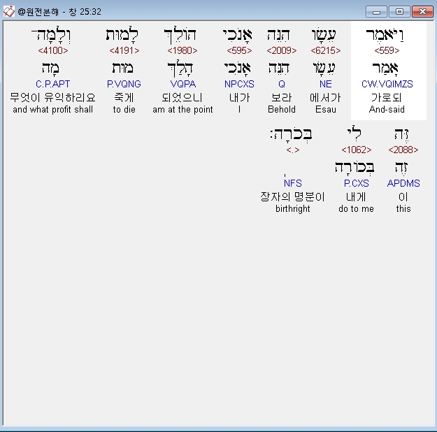 히브리어구약BHS,32 וַיֹּאמֶר עֵשָׂו הִנֵּה אָנֹכִי הֹולֵךְ לָמוּת וְלָמָּה־זֶּה לִי בְּכֹרָה׃