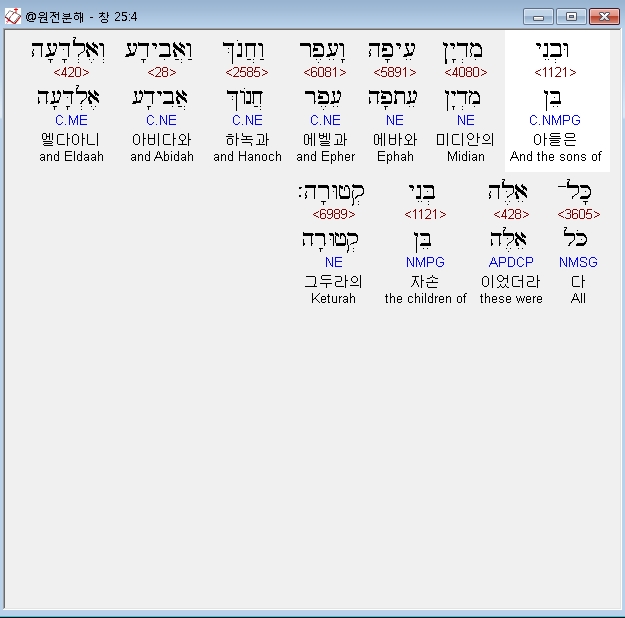 영어MSG,4 Midian had Ephah, Epher, Hanoch, Abida, and Eldaah--all from the line of Keturah.