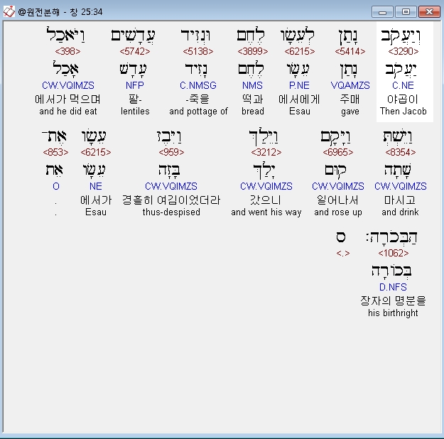 영어NASB,34 Then Jacob gave Esau bread and lentil stew; and he ate and drank, and rose and went on his way. Thus Esau despised his birthright.