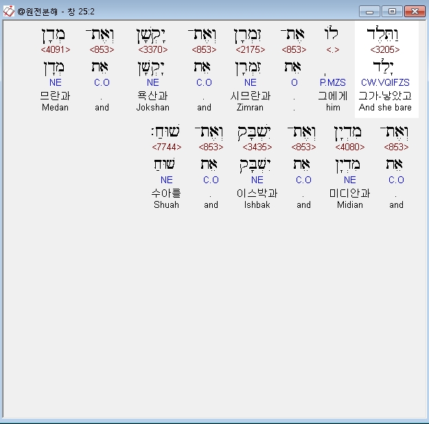 영어MSG,2 She gave birth to Zimran, Jokshan, Medan, Midian, Ishbak, and Shuah.