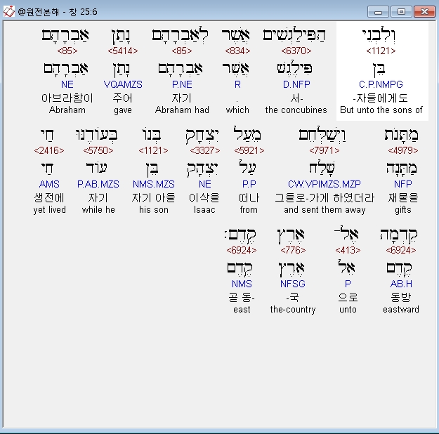히브리어구약BHS,6 וְלִבְנֵי הַפִּילַגְשִׁים אֲשֶׁר לְאַבְרָהָם נָתַן אַבְרָהָם מַתָּנֹת וַיְשַׁלְּחֵם מֵעַל יִצְחָק בְּנֹו בְּעֹודֶנּוּ חַי קֵדְמָה אֶל־אֶרֶץ קֶדֶם׃