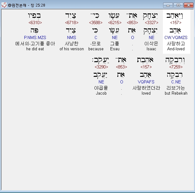 좋아하므로 (*, 아하브) - '애정을 갖다' '사랑하다'는 뜻으로 선택의 원인이 사랑에 있음을 표현할 때 사용된다(신10:15; 말1:2, 3). 반면에 불선택의 미움을 의미할 때는 '사네' (*)란 말이 사용된다(말 1:3). 또한 하나님이 베푸시는 언약적 사랑을 표현할 때는 '헤세드'(*)란 말을 썼다(신 7:9;미 7:20;왕상8:23). 본문에서는 에서를 편애한 이삭의 선택적 사랑이 에서의 사냥한 고기로 인함임을 밝힌다. 결국 이러한 부모의 편애가 자녀에게 끼친 영향을 두 아들의 생애와 그 후손의 역사에서 볼 수 있다.