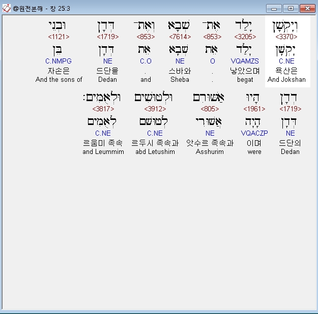 영어MSG,3 Jokshan had Sheba and Dedan. Dedan's descendants were the Asshurim, the Letushim, and the Leummim.