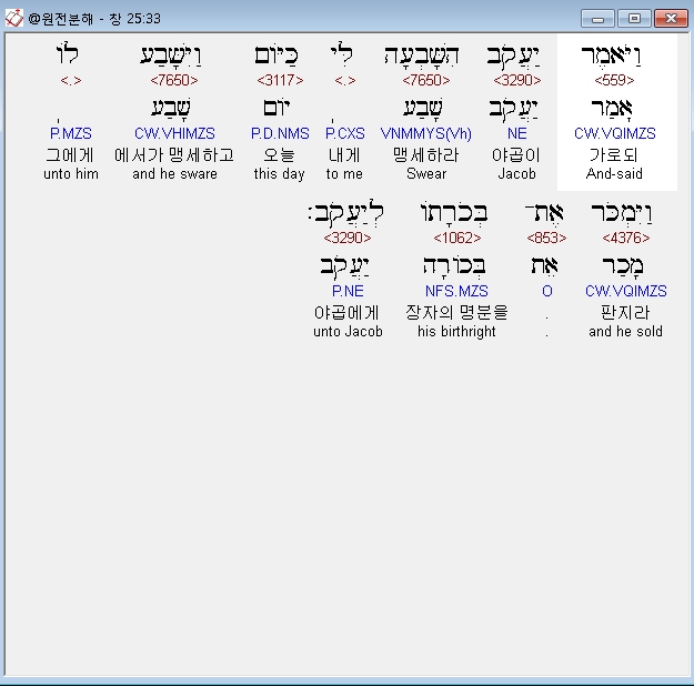 히브리어구약BHS,31 וַיֹּאמֶר יַעֲקֹב מִכְרָה כַיֹּום אֶת־בְּכֹרָתְךָ לִי׃