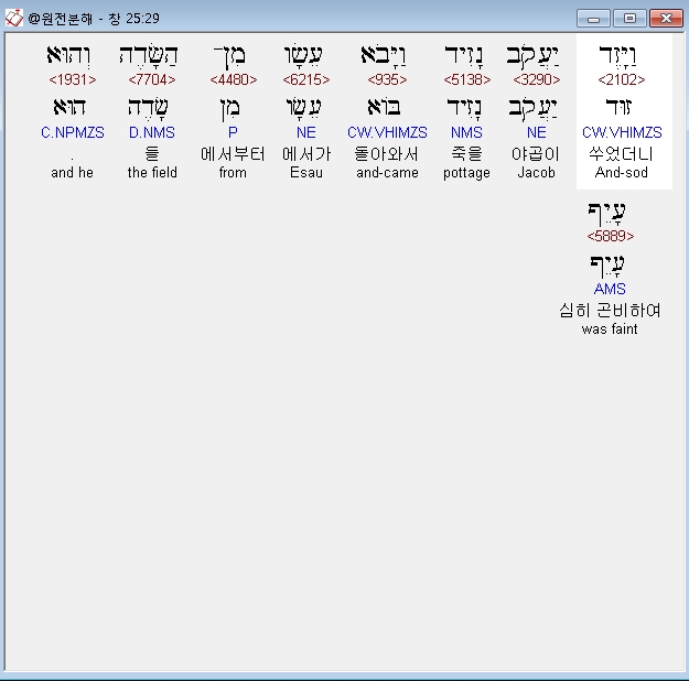 히브리어구약BHS,29 וַיָּזֶד יַעֲקֹב נָזִיד וַיָּבֹא עֵשָׂו מִן־הַשָּׂדֶה וְהוּא עָיֵף׃
