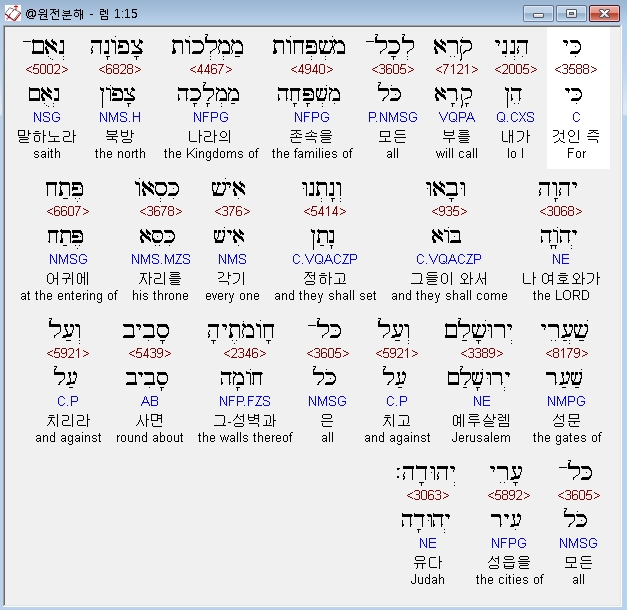 히브리어구약BHS,15 כִּי הִנְנִי קֹרֵא לְכָל־מִשְׁפְּחֹות מַמְלְכֹות צָפֹונָה נְאֻם־יְהוָה וּבָאוּ וְנָתְנוּ אִישׁ כִּסְאֹו פֶּתַח שַׁעֲרֵי יְרוּשָׁלִַם וְעַל כָּל־חֹומֹתֶיהָ סָבִיב וְעַל כָּל־עָרֵי יְהוּדָה׃