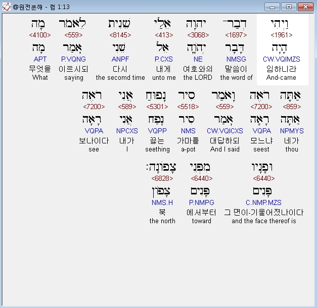 히브리어구약BHS,13 וַיְהִי דְבַר־יְהוָה אֵלַי שֵׁנִית לֵאמֹר מָה אַתָּה רֹאֶה וָאֹמַר סִיר נָפוּחַ אֲנִי רֹאֶה וּפָנָיו מִפְּנֵי צָפֹונָה׃