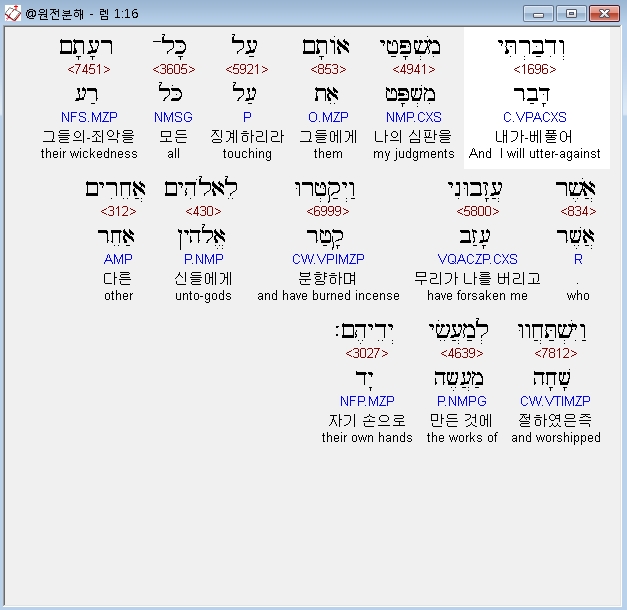 히브리어구약BHS,16 וְדִבַּרְתִּי מִשְׁפָּטַי אֹותָם עַל כָּל־רָעָתָם אֲשֶׁר עֲזָבוּנִי וַיְקַטְּרוּ לֵאלֹהִים אֲחֵרִים וַיִּשְׁתַּחֲווּ לְמַעֲשֵׂי יְדֵיהֶם׃