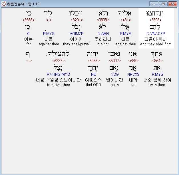 히브리어구약BHS,19 וְנִלְחֲמוּ אֵלֶיךָ וְלֹא־יוּכְלוּ לָךְ כִּי־אִתְּךָ אֲנִי נְאֻם־יְהוָה לְהַצִּילֶךָ׃ ף