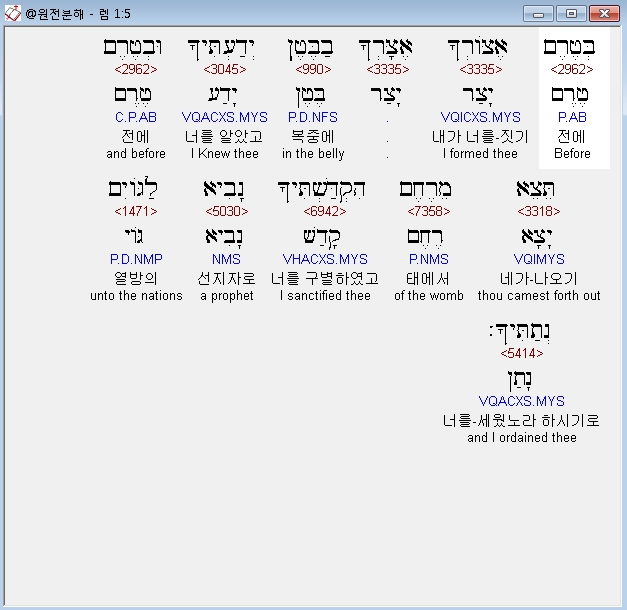 히브리어구약BHS,5 בְּטֶרֶם [כ= אֶצֹּורְךָ] [ק= אֶצָּרְךָ] בַבֶּטֶן יְדַעְתִּיךָ וּבְטֶרֶם תֵּצֵא מֵרֶחֶם הִקְדַּשְׁתִּיךָ נָבִיא לַגֹּויִם נְתַתִּיךָ׃