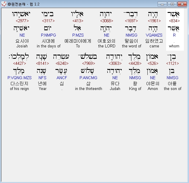 히브리어구약BHS,2 אֲשֶׁר הָיָה דְבַר־יְהוָה אֵלָיו בִּימֵי יֹאשִׁיָּהוּ בֶן־אָמֹון מֶלֶךְ יְהוּדָה בִּשְׁלֹשׁ־עֶשְׂרֵה שָׁנָה לְמָלְכֹו׃