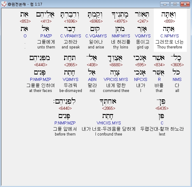 히브리어구약BHS,17 וְאַתָּה תֶּאְזֹר מָתְנֶיךָ וְקַמְתָּ וְדִבַּרְתָּ אֲלֵיהֶם אֵת כָּל־אֲשֶׁר אָנֹכִי אֲצַוֶּךָּ אַל־תֵּחַת מִפְּנֵיהֶם פֶּן־אֲחִתְּךָ לִפְנֵיהֶם׃