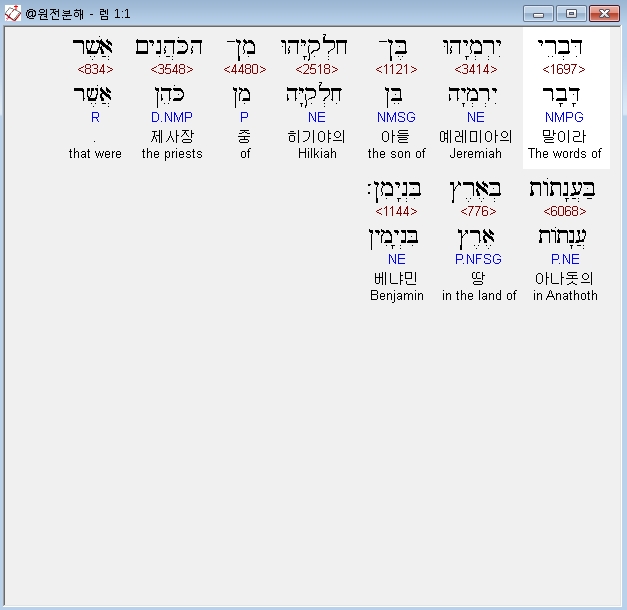 영어NASB,1 The words of Jeremiah, the son of Hilkiah, of the priests who were in Anathoth in the land of Benjamin,