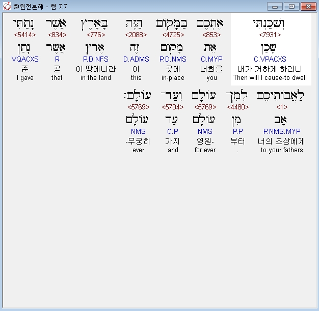 히브리어구약BHS,7 וְשִׁכַּנְתִּי אֶתְכֶם בַּמָּקֹום הַזֶּה בָּאָרֶץ אֲשֶׁר נָתַתִּי לַאֲבֹותֵיכֶם לְמִן־עֹולָם וְעַד־עֹולָם׃