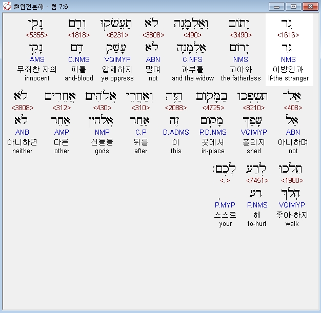 히브리어구약BHS,6 גֵּר יָתֹום וְאַלְמָנָה לֹא תַעֲשֹׁקוּ וְדָם נָקִי אַל־תִּשְׁפְּכוּ בַּמָּקֹום הַזֶּה וְאַחֲרֵי אֱלֹהִים אֲחֵרִים לֹא תֵלְכוּ לְרַע לָכֶם׃