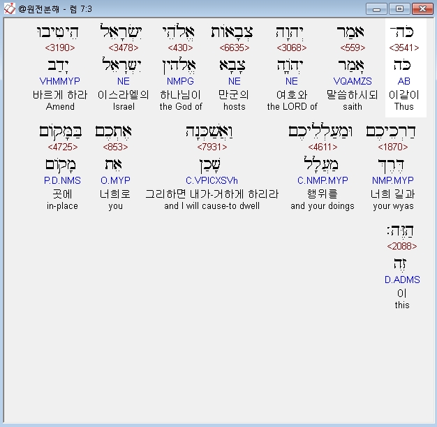 히브리어구약BHS,3 כֹּה־אָמַר יְהוָה צְבָאֹות אֱלֹהֵי יִשְׂרָאֵל הֵיטִיבוּ דַרְכֵיכֶם וּמַעַלְלֵיכֶם וַאֲשַׁכְּנָה אֶתְכֶם בַּמָּקֹום הַזֶּה׃