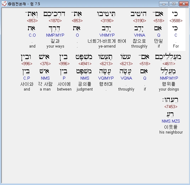 히브리어구약BHS,5 כִּי אִם־הֵיטֵיב תֵּיטִיבוּ אֶת־דַּרְכֵיכֶם וְאֶת־מַעַלְלֵיכֶם אִם־עָשֹׂו תַעֲשׂוּ מִשְׁפָּט בֵּין אִישׁ וּבֵין רֵעֵהוּ׃