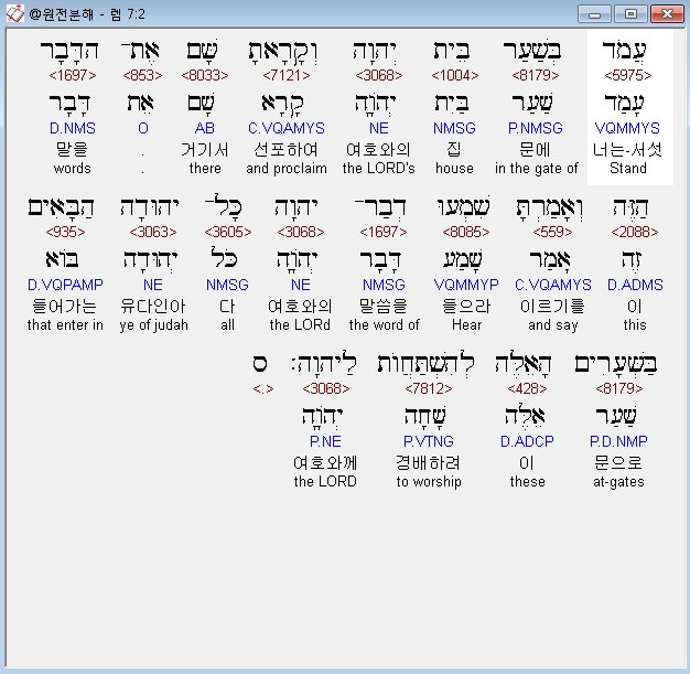 히브리어구약BHS,2 עֲמֹד בְּשַׁעַר בֵּית יְהוָה וְקָרָאתָ שָּׁם אֶת־הַדָּבָר הַזֶּה וְאָמַרְתָּ שִׁמְעוּ דְבַר־יְהוָה כָּל־יְהוּדָה הַבָּאִים בַּשְּׁעָרִים הָאֵלֶּה לְהִשְׁתַּחֲוֹת לַיהוָה׃ ס