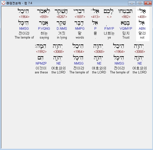 히브리어구약BHS,4 אַל־תִּבְטְחוּ לָכֶם אֶל־דִּבְרֵי הַשֶּׁקֶר לֵאמֹר הֵיכַל יְהוָה הֵיכַל יְהוָה הֵיכַל יְהוָה הֵמָּה׃