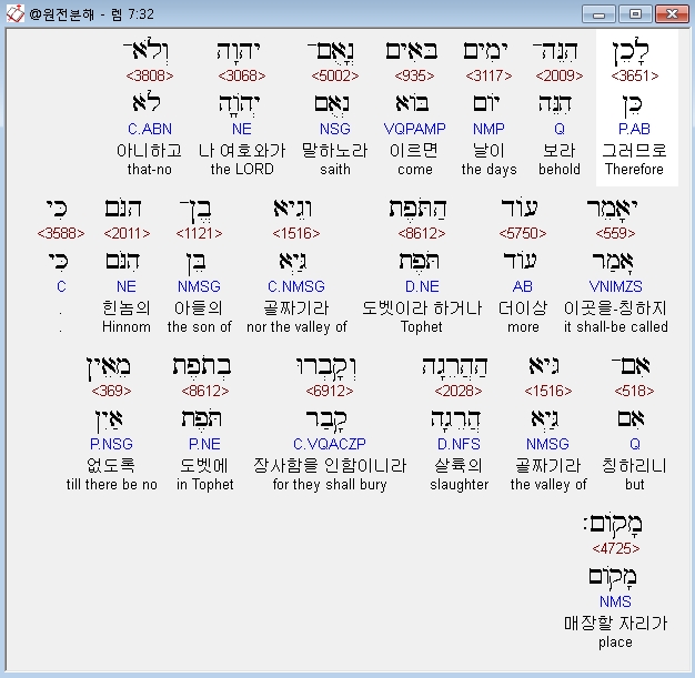 히브리어구약BHS,32 לָכֵן הִנֵּה־יָמִים בָּאִים נְאֻם־יְהוָה וְלֹא־יֵאָמֵר עֹוד הַתֹּפֶת וְגֵיא בֶן־הִנֹּם כִּי אִם־גֵּיא הַהֲרֵגָה וְקָבְרוּ בְתֹפֶת מֵאֵין מָקֹום׃
