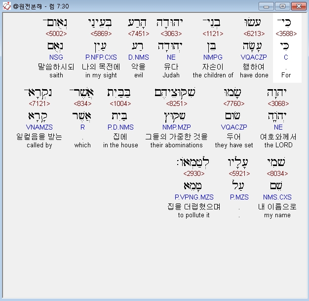 히브리어구약BHS,30 כִּי־עָשׂוּ בְנֵי־יְהוּדָה הָרַע בְּעֵינַי נְאֻום־יְהוָה שָׂמוּ שִׁקּוּצֵיהֶם בַּבַּיִת אֲשֶׁר־נִקְרָא־שְׁמִי עָלָיו לְטַמְּאֹו׃