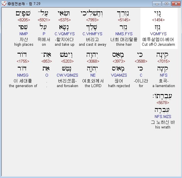 영어NASB,29 'Cut off your hair and cast it away, And take up a lamentation on the bare heights; For the LORD has rejected and forsaken The generation of His wrath.'