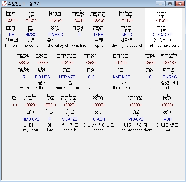 영어NASB,31 "And they have built the high places of Topheth, which is in the valley of the son of Hinnom, to burn their sons and their daughters in the fire, which I did not command, and it did not come into My mind.