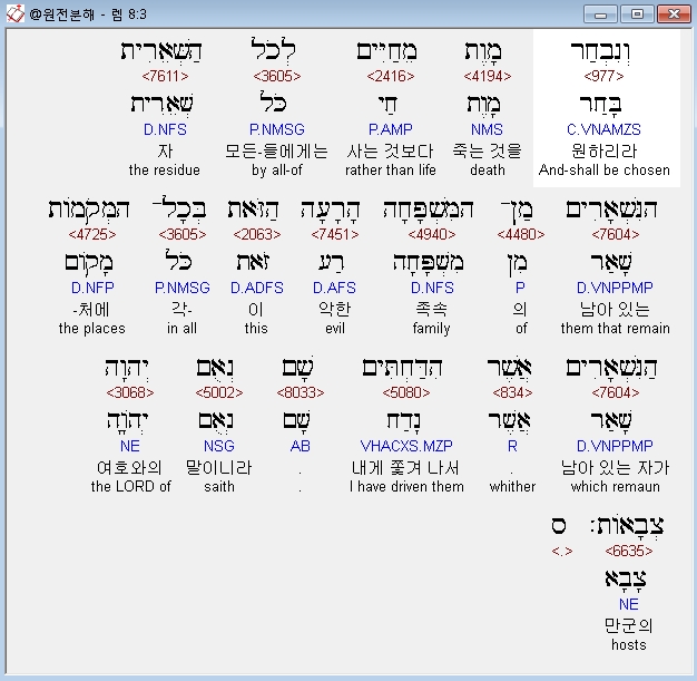 히브리어구약BHS,3 וְנִבְחַר מָוֶת מֵחַיִּים לְכֹל הַשְּׁאֵרִית הַנִּשְׁאָרִים מִן־הַמִּשְׁפָּחָה הָרָעָה הַזֹּאת בְּכָל־הַמְּקֹמֹות הַנִּשְׁאָרִים אֲשֶׁר הִדַּחְתִּים שָׁם נְאֻם יְהוָה צְבָאֹות׃ ס