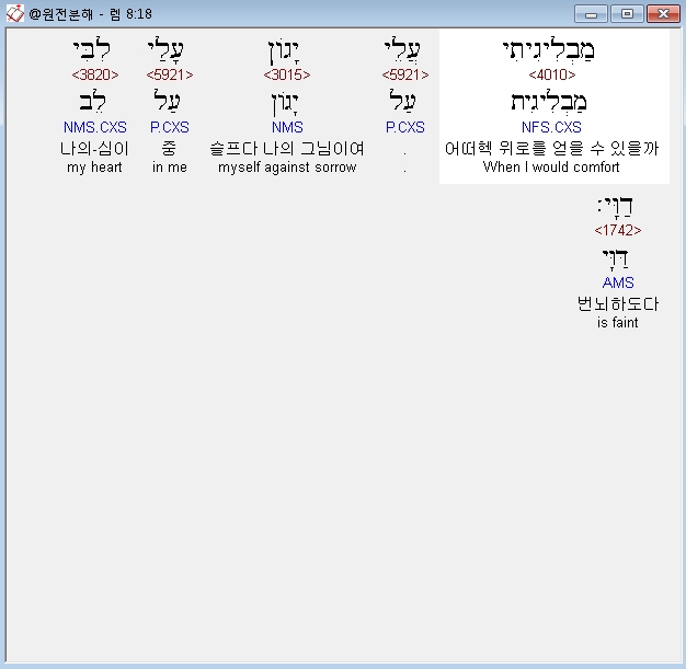 히브리어구약BHS,18 מַבְלִיגִיתִי עֲלֵי יָגֹון עָלַי לִבִּי דַוָּי׃