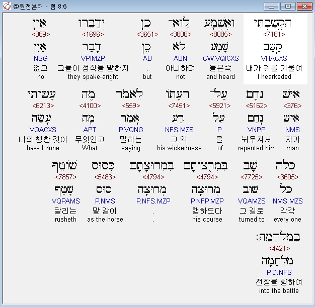 히브리어구약BHS,6 הִקְשַׁבְתִּי וָאֶשְׁמָע לֹוא־כֵן יְדַבֵּרוּ אֵין אִישׁ נִחָם עַל־רָעָתֹו לֵאמֹר מֶה עָשִׂיתִי כֻּלֹּה שָׁב [כ= בִּמְרֻצֹותָם] [ק= בִּמְרוּצָתָם] כְּסוּס שֹׁוטֵף בַּמִּלְחָמָה׃