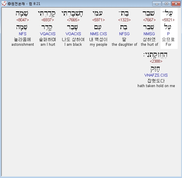 히브리어구약BHS,21 עַל־שֶׁבֶר בַּת־עַמִּי הָשְׁבָּרְתִּי קָדַרְתִּי שַׁמָּה הֶחֱזִקָתְנִי׃