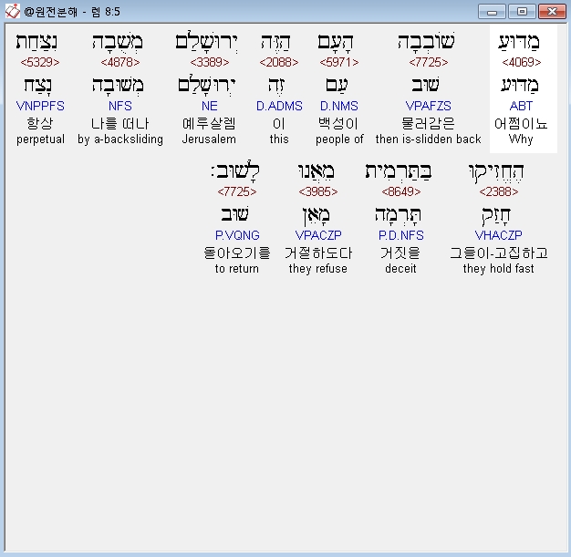 히브리어구약BHS,5 מַדּוּעַ שֹׁובְבָה הָעָם הַזֶּה יְרוּשָׁלִַם מְשֻׁבָה נִצַּחַת הֶחֱזִיקוּ בַּתַּרְמִית מֵאֲנוּ לָשׁוּב׃