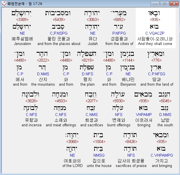 히브리어구약BHS,26 וּבָאוּ מֵעָרֵי־יְהוּדָה וּמִסְּבִיבֹות יְרוּשָׁלִַם וּמֵאֶרֶץ בִּנְיָמִן וּמִן־הַשְּׁפֵלָה וּמִן־הָהָר וּמִן־הַנֶּגֶב מְבִאִים עֹולָה וְזֶבַח וּמִנְחָה וּלְבֹונָה וּמְבִאֵי תֹודָה בֵּית יְהוָה׃