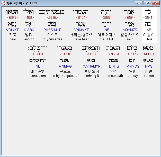 히브리어구약BHS,21 כֹּה אָמַר יְהוָה הִשָּׁמְרוּ בְּנַפְשֹׁותֵיכֶם וְאַל־תִּשְׂאוּ מַשָּׂא בְּיֹום הַשַּׁבָּת וַהֲבֵאתֶם בְּשַׁעֲרֵי יְרוּשָׁלִָם׃