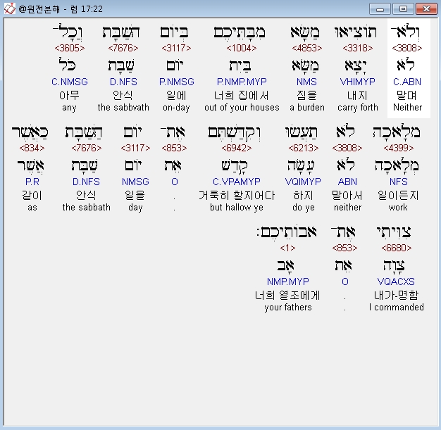 히브리어구약BHS,22 וְלֹא־תֹוצִיאוּ מַשָּׂא מִבָּתֵּיכֶם בְּיֹום הַשַּׁבָּת וְכָל־מְלָאכָה לֹא תַעֲשׂוּ וְקִדַּשְׁתֶּם אֶת־יֹום הַשַּׁבָּת כַּאֲשֶׁר צִוִּיתִי אֶת־אֲבֹותֵיכֶם׃