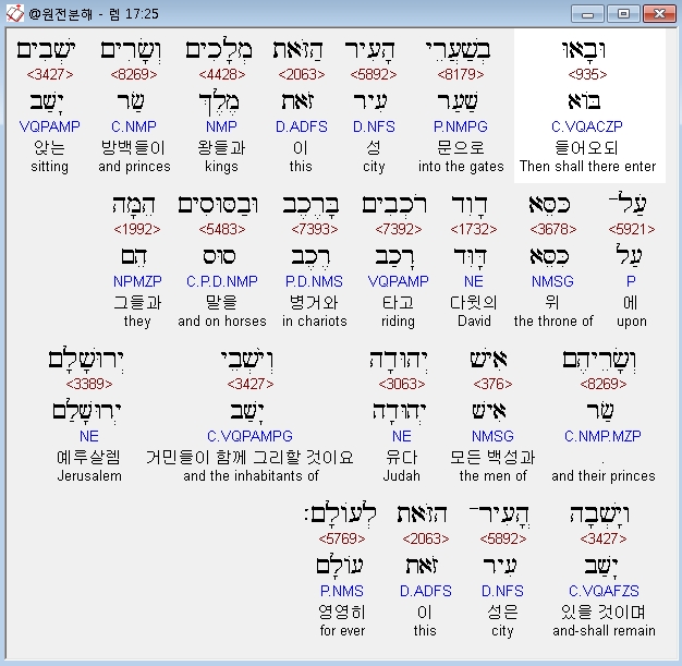히브리어구약BHS,25 וּבָאוּ בְשַׁעֲרֵי הָעִיר הַזֹּאת מְלָכִים וְשָׂרִים יֹשְׁבִים עַל־כִּסֵּא דָוִד רֹכְבִים בָּרֶכֶב וּבַסּוּסִים הֵמָּה וְשָׂרֵיהֶם אִישׁ יְהוּדָה וְיֹשְׁבֵי יְרוּשָׁלִָם וְיָשְׁבָה הָעִיר־הַזֹּאת לְעֹולָם׃
