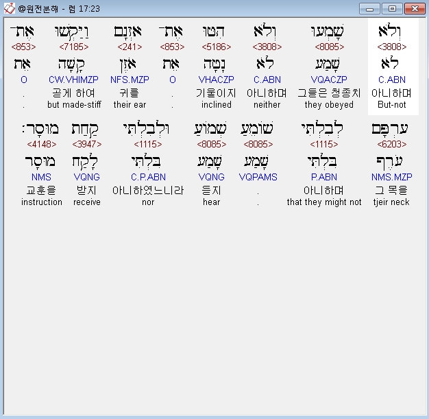 우리말성경,23 그러나 그들은 듣지도 않고 귀를 기울이지도 않았다. 오히려 그들은 목을 굳게 세워 들으려고 하지도 않고 훈계를 받으려고도 하지 않았다.