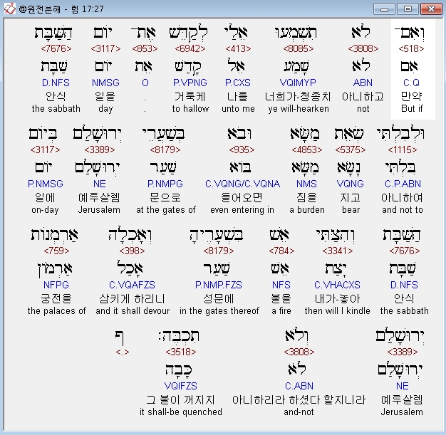 헬라어구약Septuagint,27 και εσται εαν μη εισακουσητε μου του αγιαζειν την ημεραν των σαββατων του μη αιρειν βασταγματα και μη εισπορευεσθαι ταις πυλαις ιερουσαλημ εν τη ημερα των σαββατων και αναψω πυρ εν ταις πυλαις αυτης και καταφαγεται αμφοδα ιερουσαλημ και ου σβεσθησεται