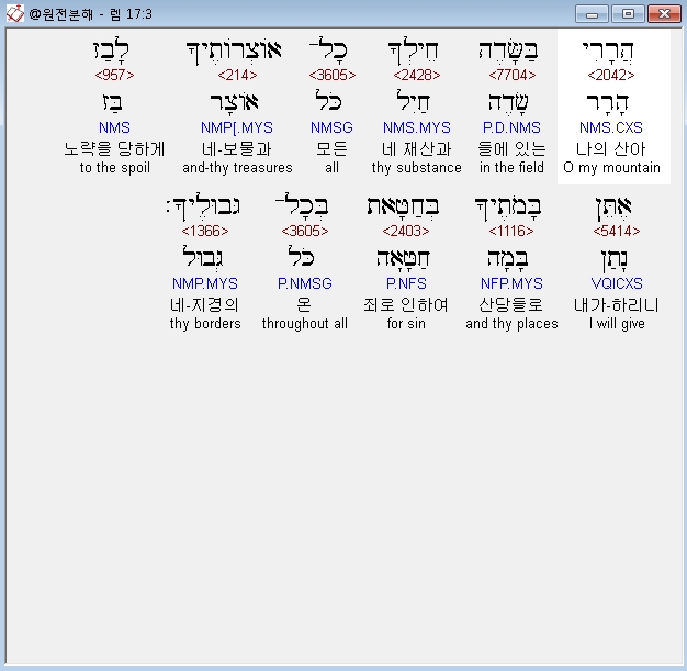 히브리어구약BHS,3 הֲרָרִי בַּשָּׂדֶה חֵילְךָ כָל־אֹוצְרֹותֶיךָ לָבַז אֶתֵּן בָּמֹתֶיךָ בְּחַטָּאת בְּכָל־גְּבוּלֶיךָ׃