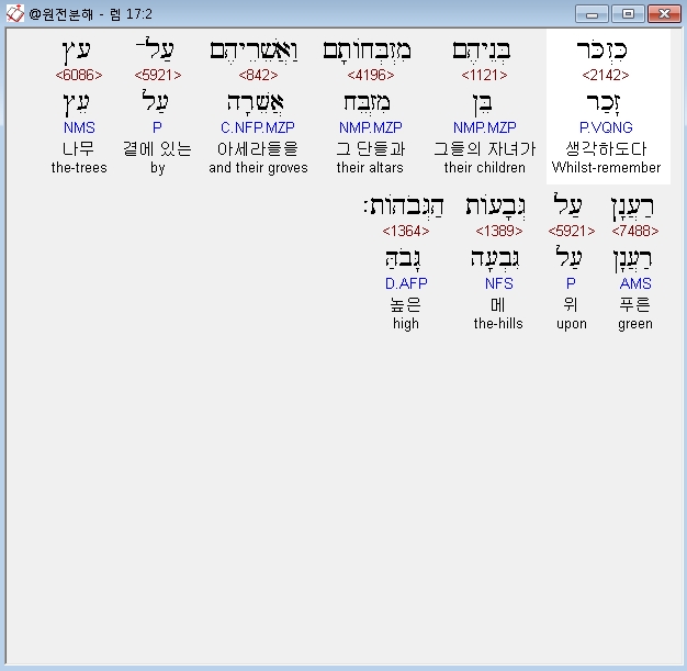 히브리어구약BHS,2 כִּזְכֹּר בְּנֵיהֶם מִזְבְּחֹותָם וַאֲשֵׁרֵיהֶם עַל־עֵץ רַעֲןָן עַל גְּבָעֹות הַגְּבֹהֹות׃