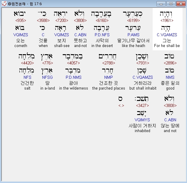 히브리어구약BHS,6 וְהָיָה כְּעַרְעָר בָּעֲרָבָה וְלֹא יִרְאֶה כִּי־יָבֹוא טֹוב וְשָׁכַן חֲרֵרִים בַּמִּדְבָּר אֶרֶץ מְלֵחָה וְלֹא תֵשֵׁב׃ ס