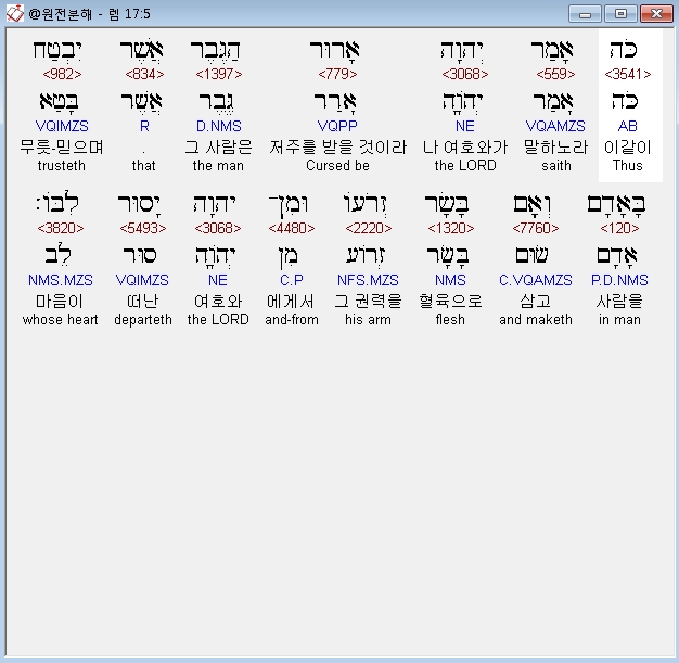 히브리어구약BHS,5 כֹּה אָמַר יְהוָה אָרוּר הַגֶּבֶר אֲשֶׁר יִבְטַח בָּאָדָם וְשָׂם בָּשָׂר זְרֹעֹו וּמִן־יְהוָה יָסוּר לִבֹּו׃