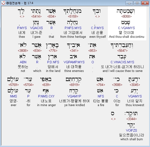 히브리어구약BHS,4 וְשָׁמַטְתָּה וּבְךָ מִנַּחֲלָתְךָ אֲשֶׁר נָתַתִּי לָךְ וְהַעֲבַדְתִּיךָ אֶת־אֹיְבֶיךָ בָּאָרֶץ אֲשֶׁר לֹא־יָדָעְתָּ כִּי־אֵשׁ קְדַחְתֶּם בְּאַפִּי עַד־עֹולָם תּוּקָד׃ ס