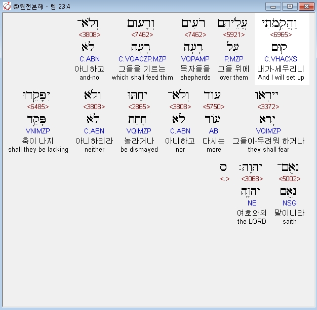 히브리어구약BHS,4 וַהֲקִמֹתִי עֲלֵיהֶם רֹעִים וְרָעוּם וְלֹא־יִירְאוּ עֹוד וְלֹא־יֵחַתּוּ וְלֹא יִפָּקֵדוּ נְאֻם־יְהוָה׃ ס