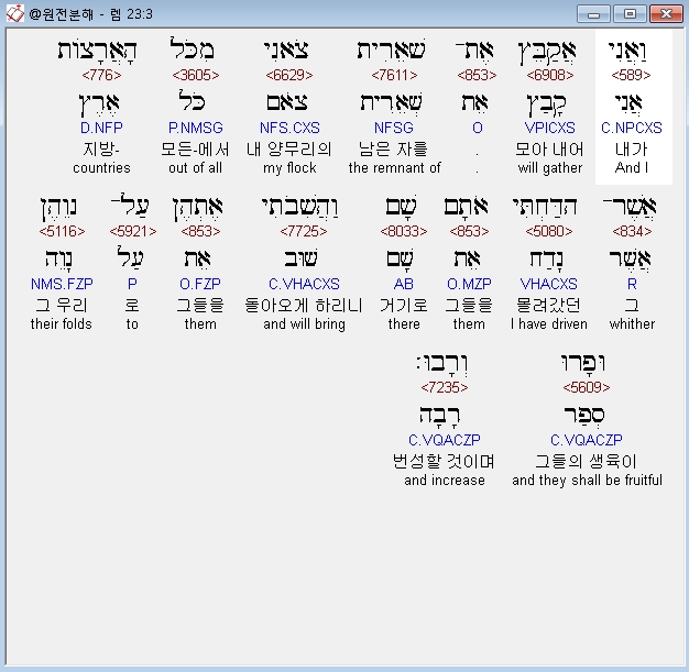 히브리어구약BHS,3 וַאֲנִי אֲקַבֵּץ אֶת־שְׁאֵרִית צֹאנִי מִכֹּל הָאֲרָצֹות אֲשֶׁר־הִדַּחְתִּי אֹתָם שָׁם וַהֲשִׁבֹתִי אֶתְהֶן עַל־נְוֵהֶן וּפָרוּ וְרָבוּ׃