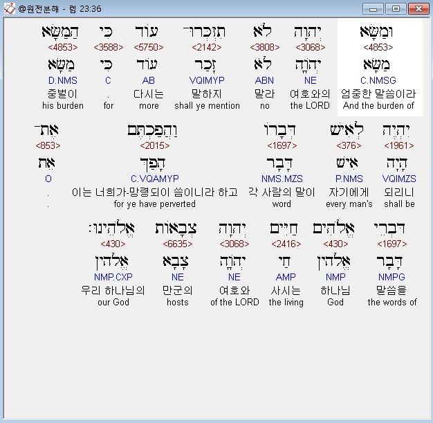 히브리어구약BHS,36 וּמַשָּׂא יְהוָה לֹא תִזְכְּרוּ־עֹוד כִּי הַמַּשָּׂא יִהְיֶה לְאִישׁ דְּבָרֹו וַהֲפַכְתֶּם אֶת־דִּבְרֵי אֱלֹהִים חַיִּים יְהוָה צְבָאֹות אֱלֹהֵינוּ׃