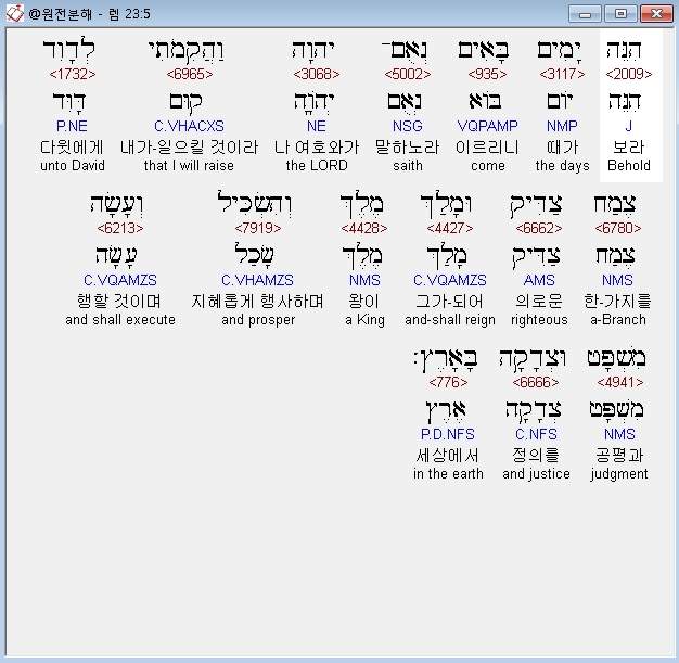 히브리어구약BHS,5 הִנֵּה יָמִים בָּאִים נְאֻם־יְהוָה וַהֲקִמֹתִי לְדָוִד צֶמַח צַדִּיק וּמָלַךְ מֶלֶךְ וְהִשְׂכִּיל וְעָשָׂה מִשְׁפָּט וּצְדָקָה בָּאָרֶץ׃