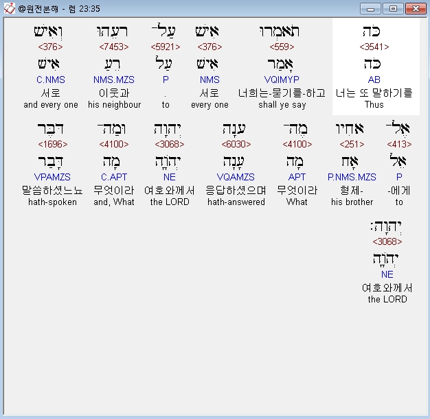 히브리어구약BHS,35 כֹּה תֹאמְרוּ אִישׁ עַל־רֵעֵהוּ וְאִישׁ אֶל־אָחִיו מֶה־עָנָה יְהוָה וּמַה־דִּבֶּר יְהוָה׃