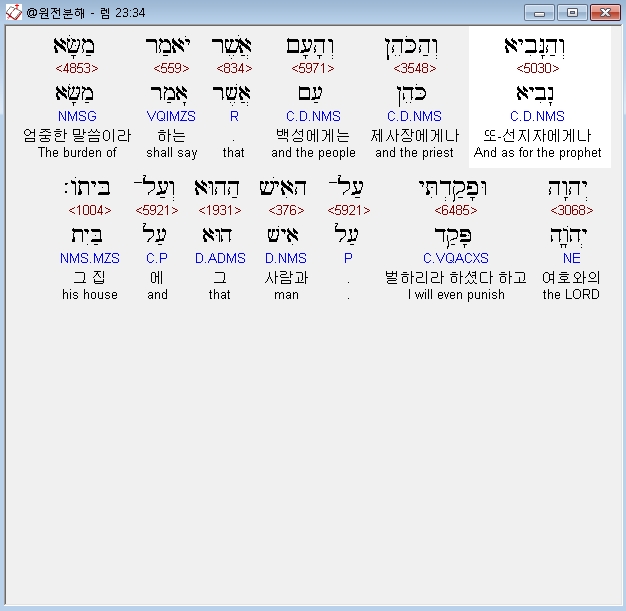 히브리어구약BHS,34 וְהַנָּבִיא וְהַכֹּהֵן וְהָעָם אֲשֶׁר יֹאמַר מַשָּׂא יְהוָה וּפָקַדְתִּי עַל־הָאִישׁ הַהוּא וְעַל־בֵּיתֹו׃